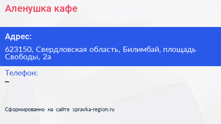 Аленушка, кафе по адресу 623150, Свердловская область, Билимбай, площадь Свободы, 2а в дальнейшем Организация, размещена в следующих категориях: