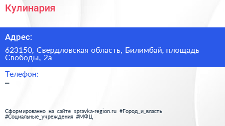 Кулинария по адресу 623150, Свердловская область, Билимбай, площадь Свободы, 2а в дальнейшем Организация, размещена в следующих категориях: