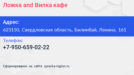 Ложка and Вилка, кафе по адресу 623150, Свердловская область, Билимбай, Ленина, 161 в дальнейшем Организация, размещена в следующих категориях: