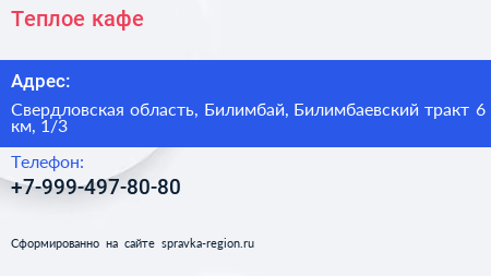 Теплое, кафе по адресу Свердловская область, Билимбай, Билимбаевский тракт 6 км, 1/3 в дальнейшем Организация, размещена в следующих категориях:
