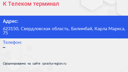 К Телеком, терминал по адресу 623150, Свердловская область, Билимбай, Карла Маркса, 75 в дальнейшем Организация, размещена в следующих категориях:
