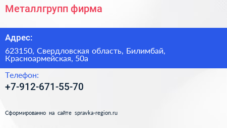 Металлгрупп, фирма по адресу 623150, Свердловская область, Билимбай, Красноармейская, 50а в дальнейшем Организация, размещена в следующих категориях: