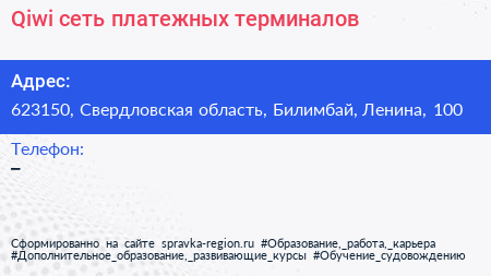 Qiwi, сеть платежных терминалов по адресу 623150, Свердловская область, Билимбай, Ленина, 100 в дальнейшем Организация, размещена в следующих категориях: