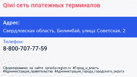 Qiwi, сеть платежных терминалов по адресу Свердловская область, Билимбай, улица Советская, 2 в дальнейшем Организация, размещена в следующих категориях: