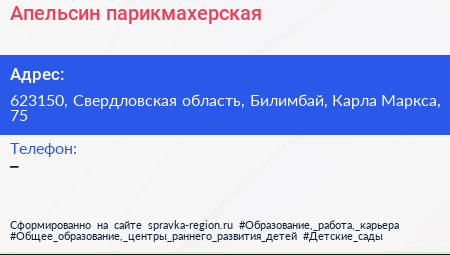 Апельсин, парикмахерская по адресу 623150, Свердловская область, Билимбай, Карла Маркса, 75 в дальнейшем Организация, размещена в следующих категориях: