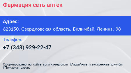 Фармация, сеть аптек по адресу 623150, Свердловская область, Билимбай, Ленина, 98 в дальнейшем Организация, размещена в следующих категориях:
