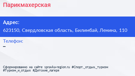 Парикмахерская по адресу 623150, Свердловская область, Билимбай, Ленина, 110 в дальнейшем Организация, размещена в следующих категориях: