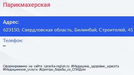 Парикмахерская по адресу 623150, Свердловская область, Билимбай, Строителей, 45 в дальнейшем Организация, размещена в следующих категориях: