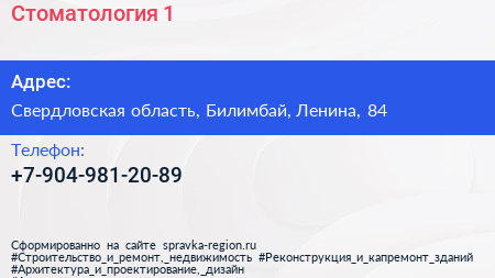 Стоматология № 1 по адресу Свердловская область, Билимбай, Ленина, 84 в дальнейшем Организация, размещена в следующих категориях: