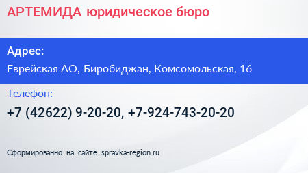 АРТЕМИДА, юридическое бюро по адресу Еврейская АО, Биробиджан, Комсомольская, 16 в дальнейшем Организация, размещена в следующих категориях: