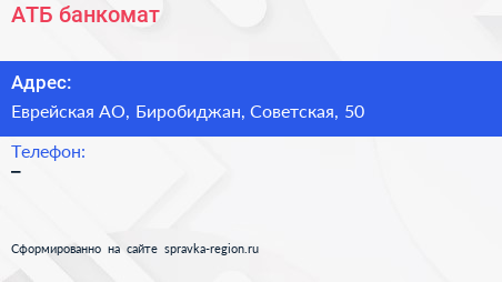 АТБ, банкомат по адресу Еврейская АО, Биробиджан, Советская, 50 в дальнейшем Организация, размещена в следующих категориях: