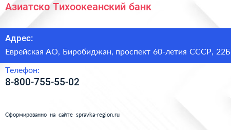 Азиатско-Тихоокеанский банк по адресу Еврейская АО, Биробиджан, проспект 60-летия СССР, 22Б в дальнейшем Организация, размещена в следующих категориях: