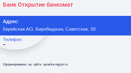 Банк Открытие, банкомат по адресу Еврейская АО, Биробиджан, Советская, 50 в дальнейшем Организация, размещена в следующих категориях: