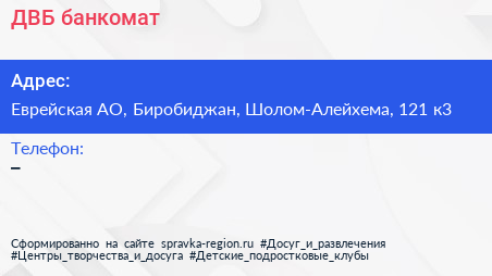 ДВБ, банкомат по адресу Еврейская АО, Биробиджан, Шолом-Алейхема, 121 к3 в дальнейшем Организация, размещена в следующих категориях: