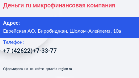 Деньги.ru, микрофинансовая компания по адресу Еврейская АО, Биробиджан, Шолом-Алейхема, 10а в дальнейшем Организация, размещена в следующих категориях: