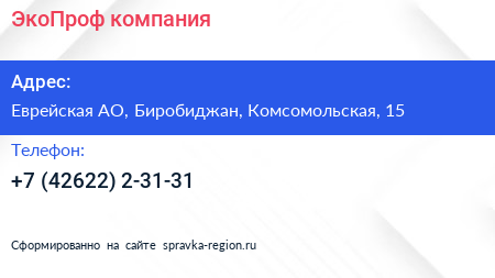 ЭкоПроф, компания по адресу Еврейская АО, Биробиджан, Комсомольская, 15 в дальнейшем Организация, размещена в следующих категориях: