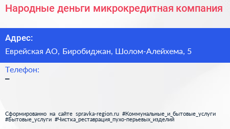 Народные деньги, микрокредитная компания по адресу Еврейская АО, Биробиджан, Шолом-Алейхема, 5 в дальнейшем Организация, размещена в следующих категориях: