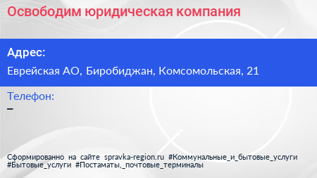 Освободим, юридическая компания по адресу Еврейская АО, Биробиджан, Комсомольская, 21 в дальнейшем Организация, размещена в следующих категориях:
