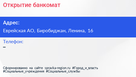 Открытие, банкомат по адресу Еврейская АО, Биробиджан, Ленина, 16 в дальнейшем Организация, размещена в следующих категориях: