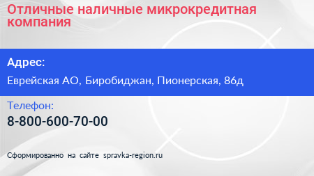 Отличные наличные, микрокредитная компания по адресу Еврейская АО, Биробиджан, Пионерская, 86д в дальнейшем Организация, размещена в следующих категориях: