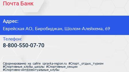 Почта Банк по адресу Еврейская АО, Биробиджан, Шолом-Алейхема, 69 в дальнейшем Организация, размещена в следующих категориях: