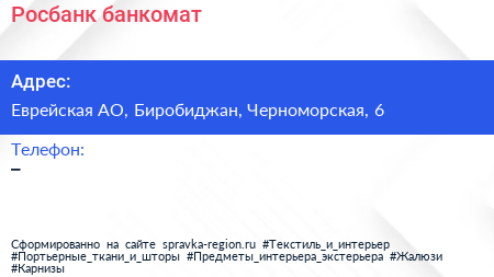 Росбанк, банкомат по адресу Еврейская АО, Биробиджан, Черноморская, 6 в дальнейшем Организация, размещена в следующих категориях: