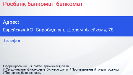 Росбанк, банкомат, банкомат по адресу Еврейская АО, Биробиджан, Шолом-Алейхема, 78 в дальнейшем Организация, размещена в следующих категориях: