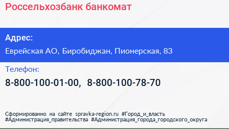 Россельхозбанк, банкомат по адресу Еврейская АО, Биробиджан, Пионерская, 83 в дальнейшем Организация, размещена в следующих категориях: