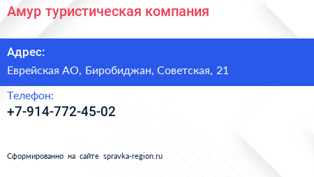 Амур, туристическая компания по адресу Еврейская АО, Биробиджан, Советская, 21 в дальнейшем Организация, размещена в следующих категориях: