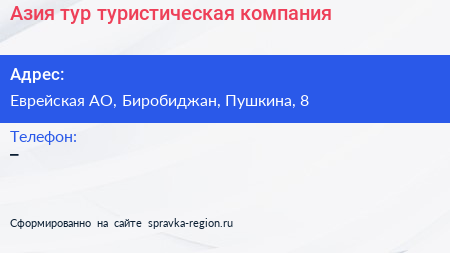 Азия тур, туристическая компания по адресу Еврейская АО, Биробиджан, Пушкина, 8 в дальнейшем Организация, размещена в следующих категориях: