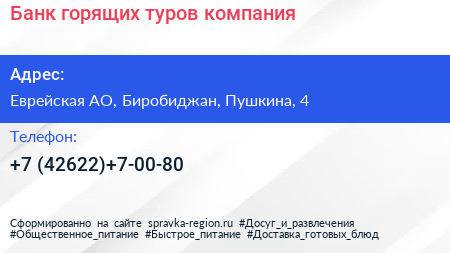 Банк горящих туров, компания по адресу Еврейская АО, Биробиджан, Пушкина, 4 в дальнейшем Организация, размещена в следующих категориях: