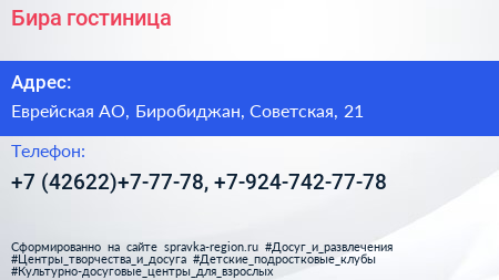 Бира, гостиница по адресу Еврейская АО, Биробиджан, Советская, 21 в дальнейшем Организация, размещена в следующих категориях: