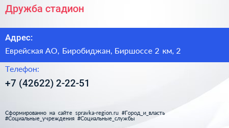 Дружба, стадион по адресу Еврейская АО, Биробиджан, Биршоссе 2 км, 2 в дальнейшем Организация, размещена в следующих категориях: