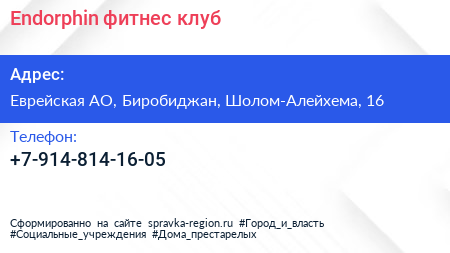 Endorphin, фитнес-клуб по адресу Еврейская АО, Биробиджан, Шолом-Алейхема, 16 в дальнейшем Организация, размещена в следующих категориях: