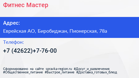 Фитнес Мастер по адресу Еврейская АО, Биробиджан, Пионерская, 78а в дальнейшем Организация, размещена в следующих категориях:
