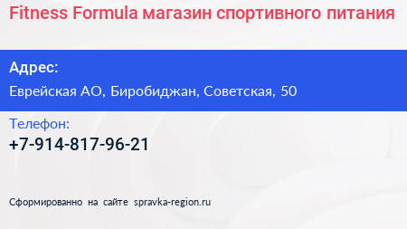 Fitness Formula, магазин спортивного питания по адресу Еврейская АО, Биробиджан, Советская, 50 в дальнейшем Организация, размещена в следующих категориях: