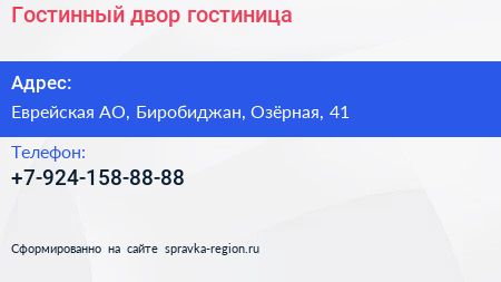 Гостинный двор, гостиница по адресу Еврейская АО, Биробиджан, Озёрная, 41 в дальнейшем Организация, размещена в следующих категориях:
