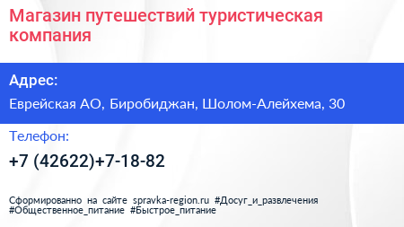 Магазин путешествий, туристическая компания по адресу Еврейская АО, Биробиджан, Шолом-Алейхема, 30 в дальнейшем Организация, размещена в следующих категориях: