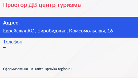Простор-ДВ, центр туризма по адресу Еврейская АО, Биробиджан, Комсомольская, 16 в дальнейшем Организация, размещена в следующих категориях: