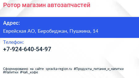 Ротор, магазин автозапчастей по адресу Еврейская АО, Биробиджан, Пушкина, 14 в дальнейшем Организация, размещена в следующих категориях: