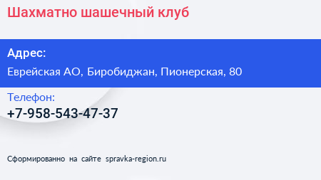 Шахматно-шашечный клуб по адресу Еврейская АО, Биробиджан, Пионерская, 80 в дальнейшем Организация, размещена в следующих категориях: