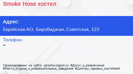 Smoke Hose, хостел по адресу Еврейская АО, Биробиджан, Советская, 123 в дальнейшем Организация, размещена в следующих категориях: