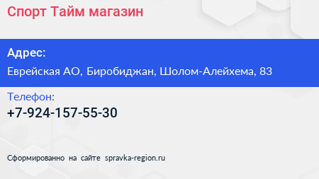 Спорт Тайм, магазин по адресу Еврейская АО, Биробиджан, Шолом-Алейхема, 83 в дальнейшем Организация, размещена в следующих категориях: