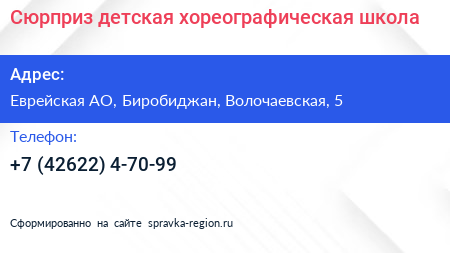 Сюрприз, детская хореографическая школа по адресу Еврейская АО, Биробиджан, Волочаевская, 5 в дальнейшем Организация, размещена в следующих категориях: