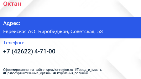 Октан по адресу Еврейская АО, Биробиджан, Советская, 53 в дальнейшем Организация, размещена в следующих категориях: