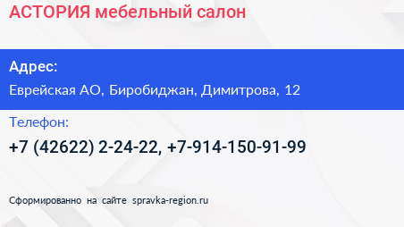 АСТОРИЯ, мебельный салон по адресу Еврейская АО, Биробиджан, Димитрова, 12 в дальнейшем Организация, размещена в следующих категориях: