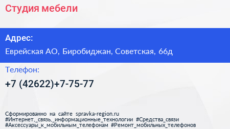 Студия мебели по адресу Еврейская АО, Биробиджан, Советская, 66д в дальнейшем Организация, размещена в следующих категориях: