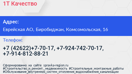 1T Качество по адресу Еврейская АО, Биробиджан, Комсомольская, 16 в дальнейшем Организация, размещена в следующих категориях: