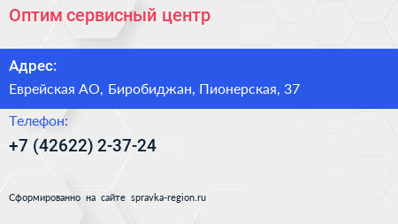 Оптим, сервисный центр по адресу Еврейская АО, Биробиджан, Пионерская, 37 в дальнейшем Организация, размещена в следующих категориях: