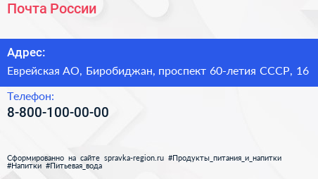 Почта России по адресу Еврейская АО, Биробиджан, проспект 60-летия СССР, 16 в дальнейшем Организация, размещена в следующих категориях: